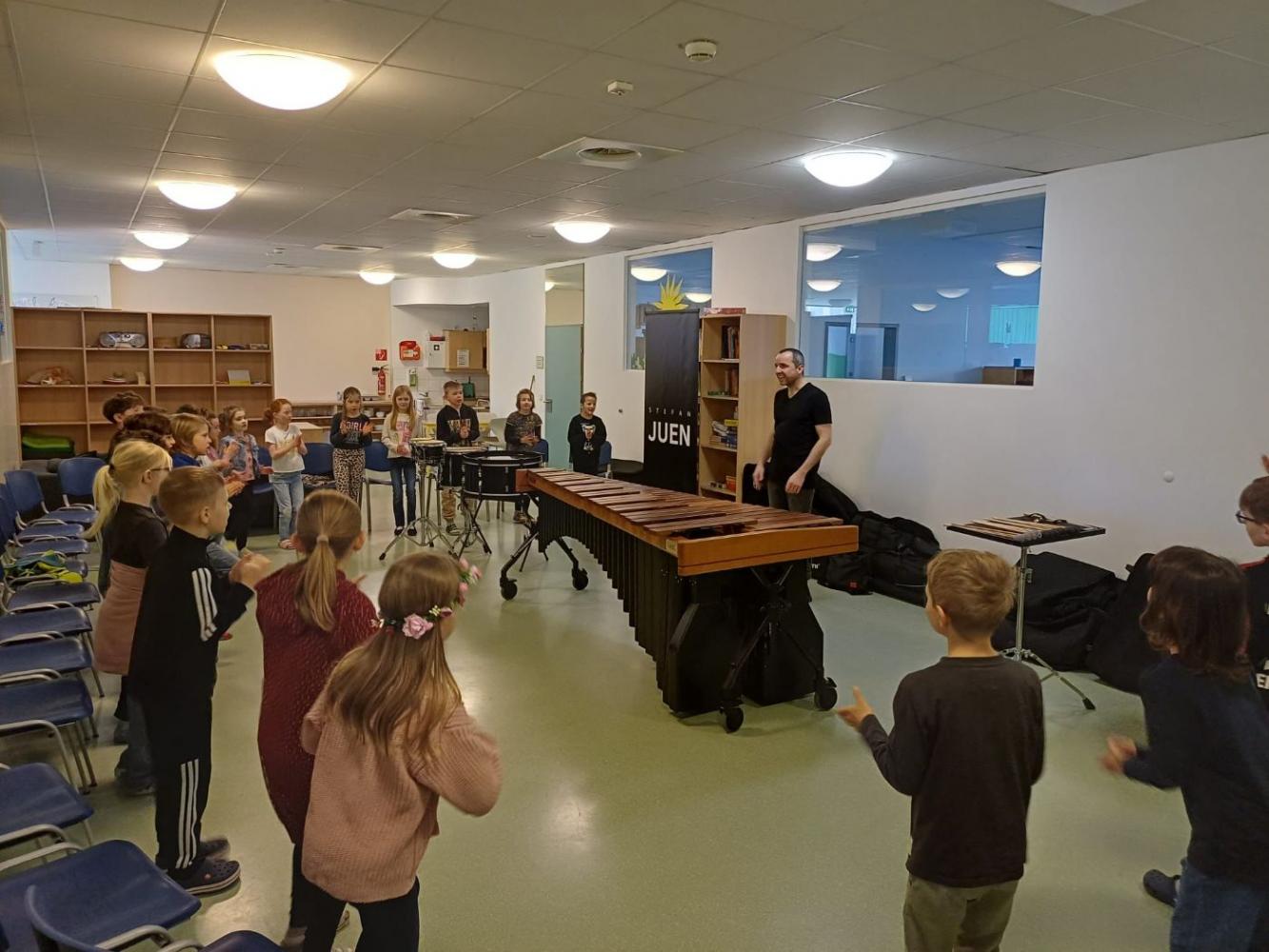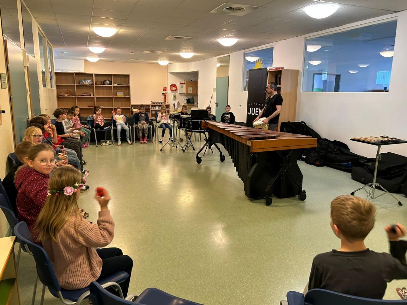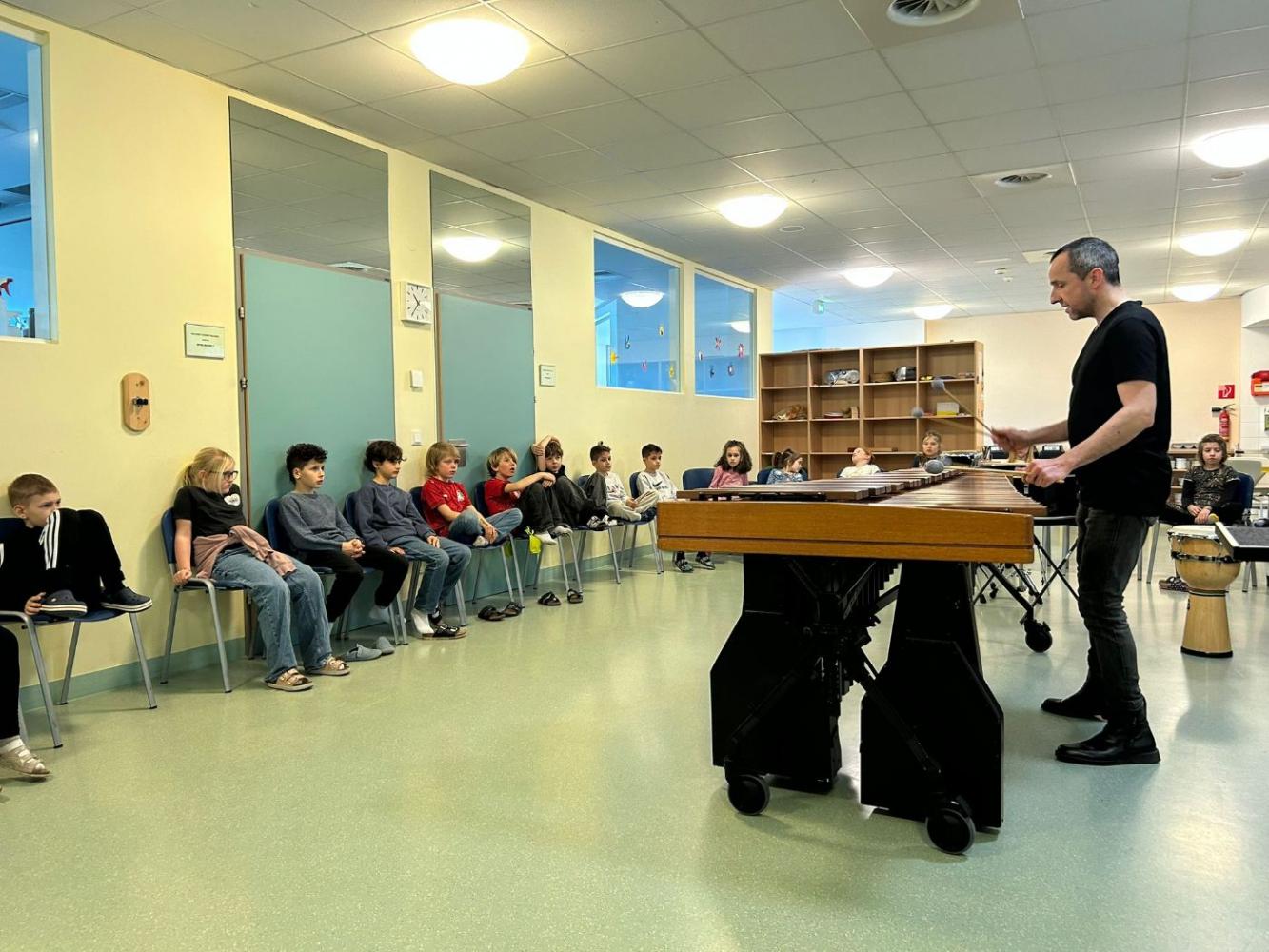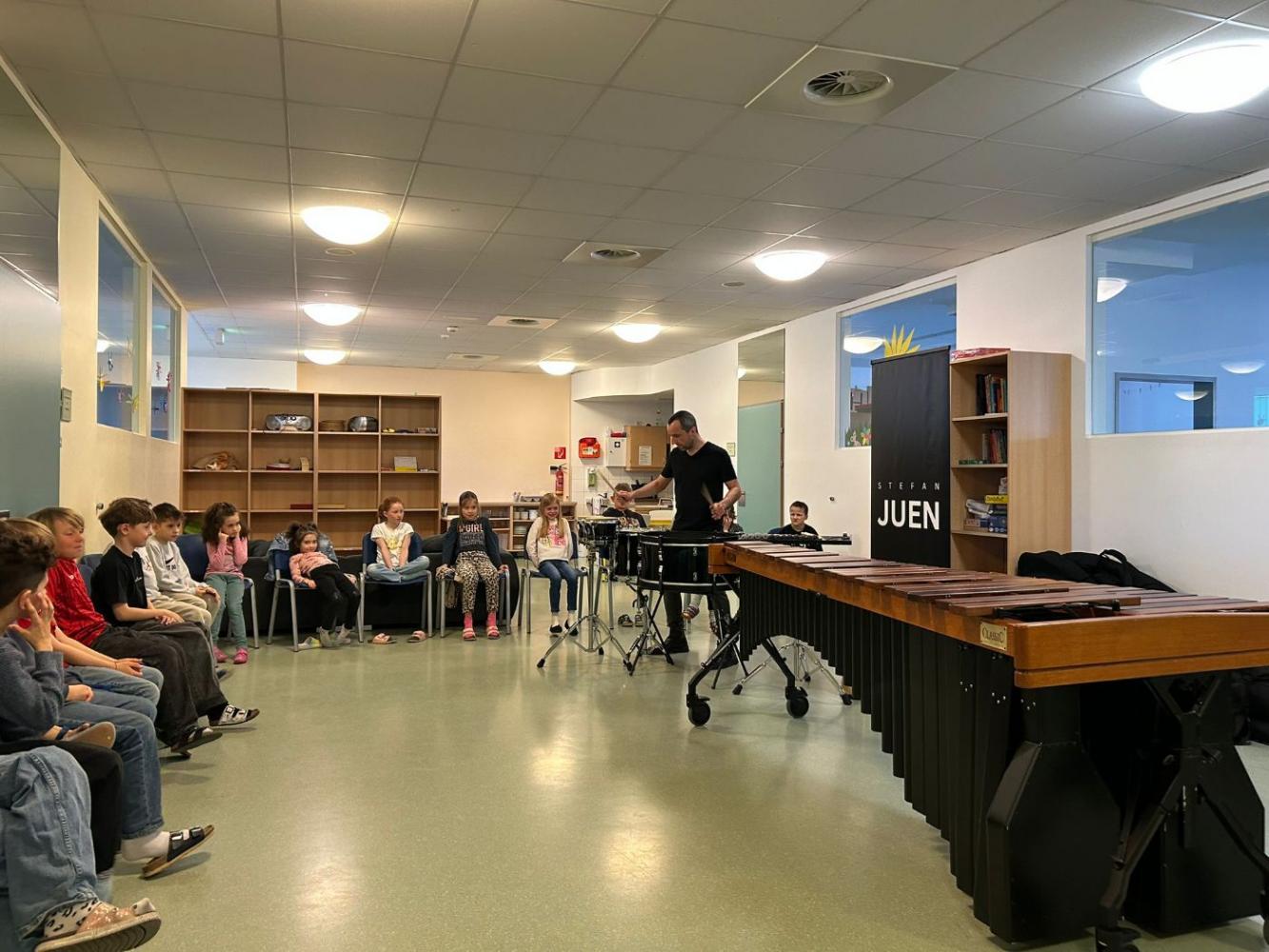 Mit großer Begeisterung präsentierte er sein Können auf der imposanten Marimba und am Schlagzeug und beeindruckte die Schülerinnen und Schüler besonders mit einer eigenen Komposition. Dabei konnten die Kinder erleben, wie vielseitig und klangreich Schlaginstrumente sein können.